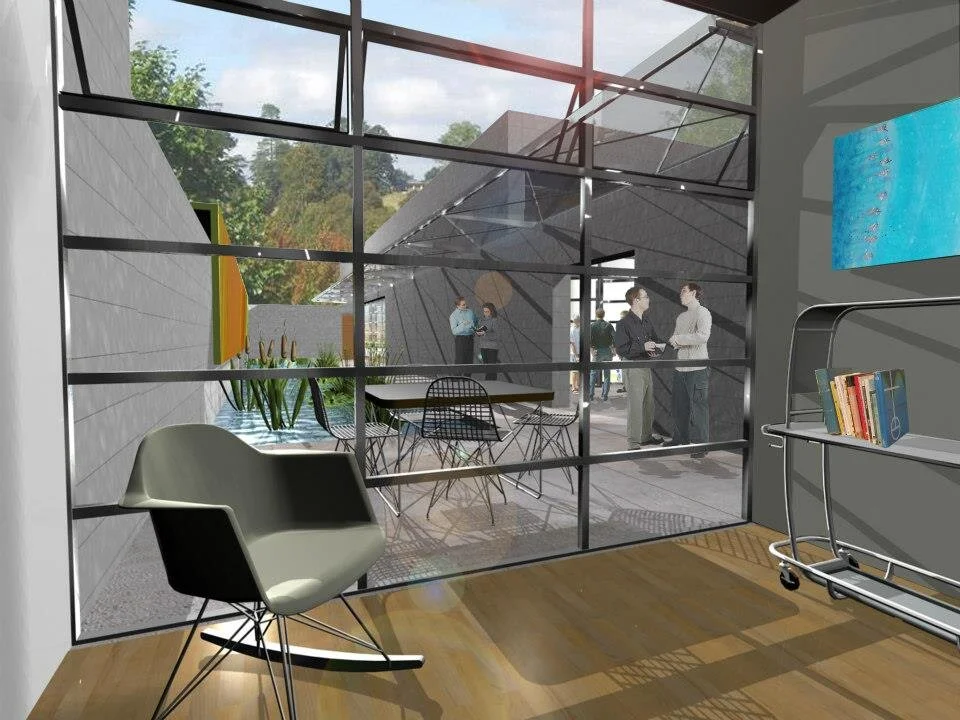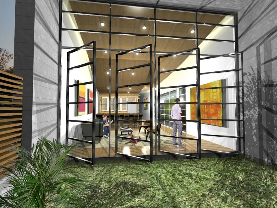 Positioned on a thin in-fill lot, this design can be understood as a contemporary interpretation of the southern dogtrot house - two separate buildings with differing functions that are connected by a covered outdoor area. The linear courtyard was conceived as an outdoor room that connects the living spaces at the front of the lot to the two story sleeping areas positioned in the rear. A transparent covered walk allows movement between the buildings in inclement weather.