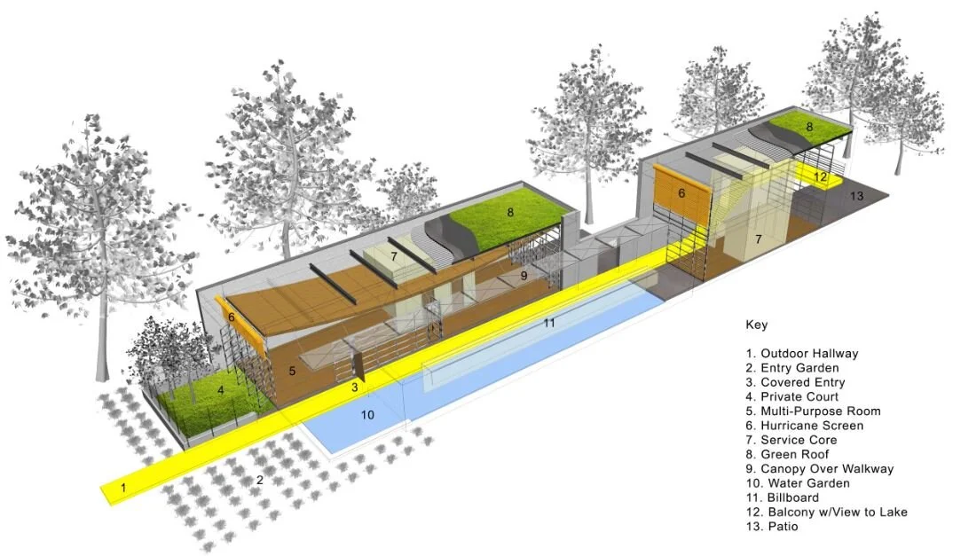 The window walls at opposite ends of each building are designed to catch prevailing winds and funnel them through the spaces. The scooped ceiling in the single story building accelerates air speed by pinching flow in the center. Each window wall is shaded from the sun and equipped with an industrial roll door that serves as a hurricane shutter. Externalizing needed circulation minimizes the amount of conditioned spaces, which translates into significant energy savings. With only 1,650 square feet of enclosed space, this design achieves a sense of luxury and openness. The green roof, high ceilings, durable/low maintenance materials and geothermal systems add to the sustainability of this structure.