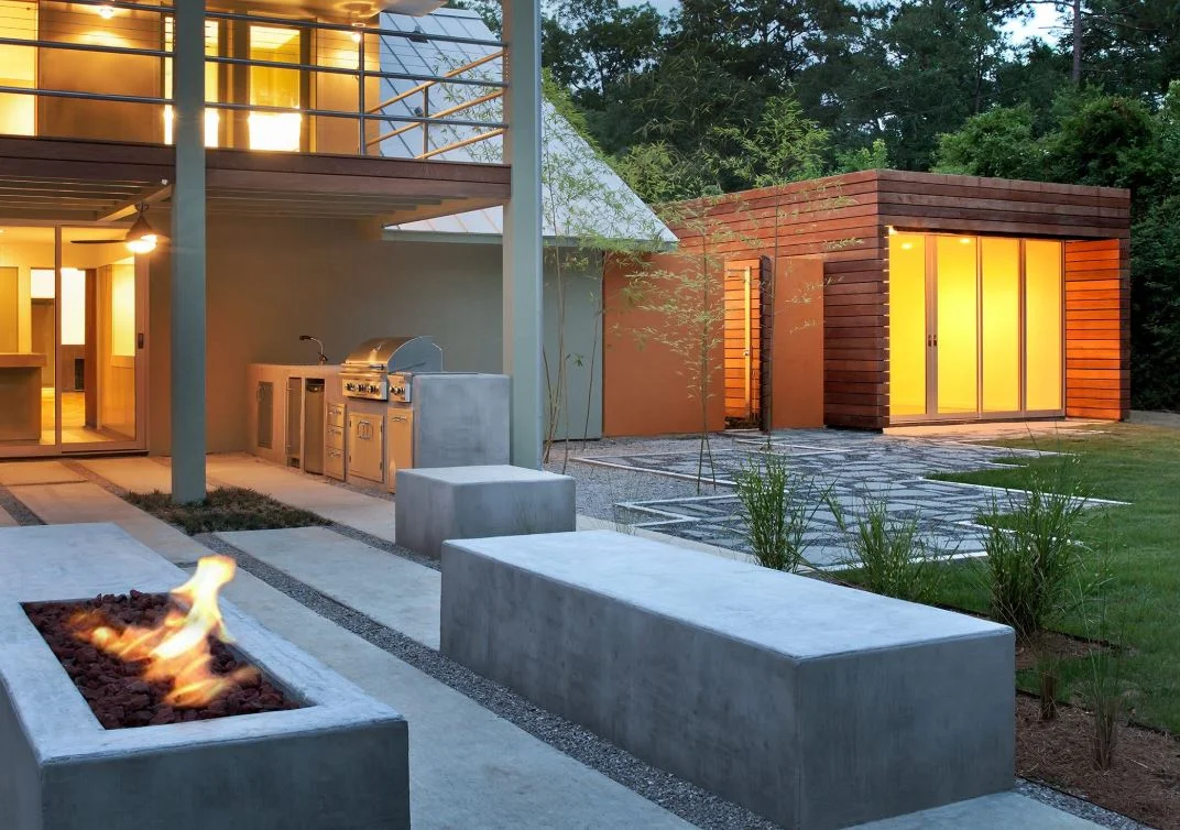 Removing walls and adding needed spaces, the house was reconfigured to open up the plan and use glass walls to connect it with the outdoors. From the tile pattern on the kitchen floor, to the linear concrete walkways, to the extended planes of the master bedroom walls and ceiling, the intent of the entire project is to draw the users attention, through the glass walls, to the landscape beyond. The owners now can enjoy expanses of beautiful views from every living and bedroom space of the house.